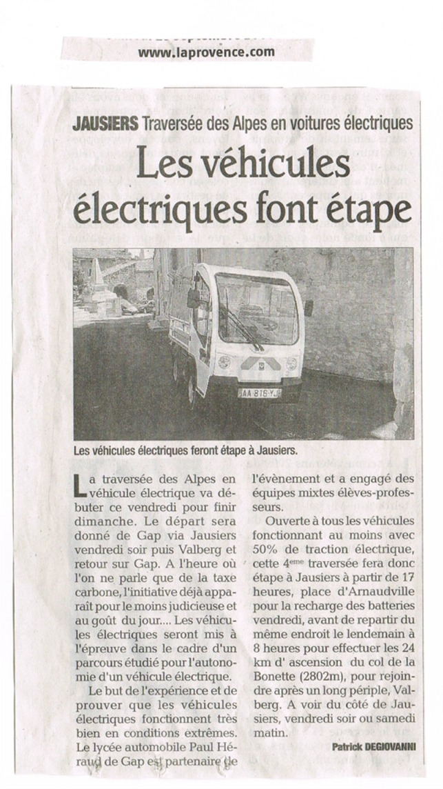 B - La Provence des 17 et 19 septembre 2009 La phase II du test hybride est ouverte avec le test de la PRIUS II , il va donc deux véhicules hybrides avec deux approches différentes qui vont faire la compétition écologique. Sur les mêmes parcours, les consommations et les coûts sont comparés à la loupe. Et vous saurez tout pour faire le choix du véhicule le plus adapté à vos besoins pour faire des économies et de l'écologie. |
