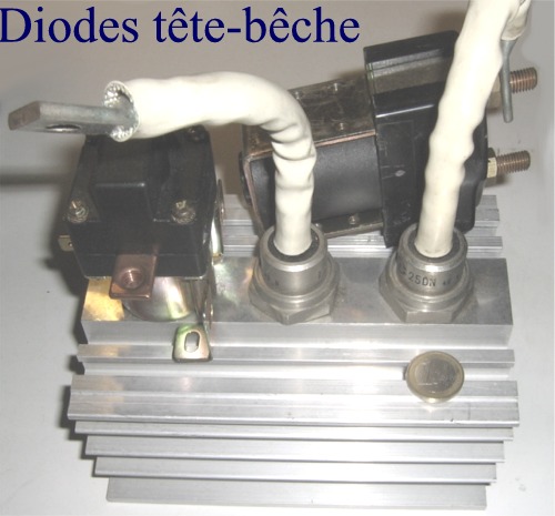 Les diodes industrielles modèles 400 Ampères crêtes sur 250 volts, récupérées sur des rebuts de pièce détachées de TGV de première génération seront court-circuitées à la demande par un relais de puissance 12 volts. Un montage hyper simple très économique. Les diodes n'auraient pas même pas besoin d'être refroidie car elles sont très largement surdimensionnées mais comme elles sont déjà connectées en tête bêche alors autant conserver le radiateur. Reste plus qu'à fixer les 2 relais sur le radiateur. Le tout sera placé dans un coffret plastique isolant.